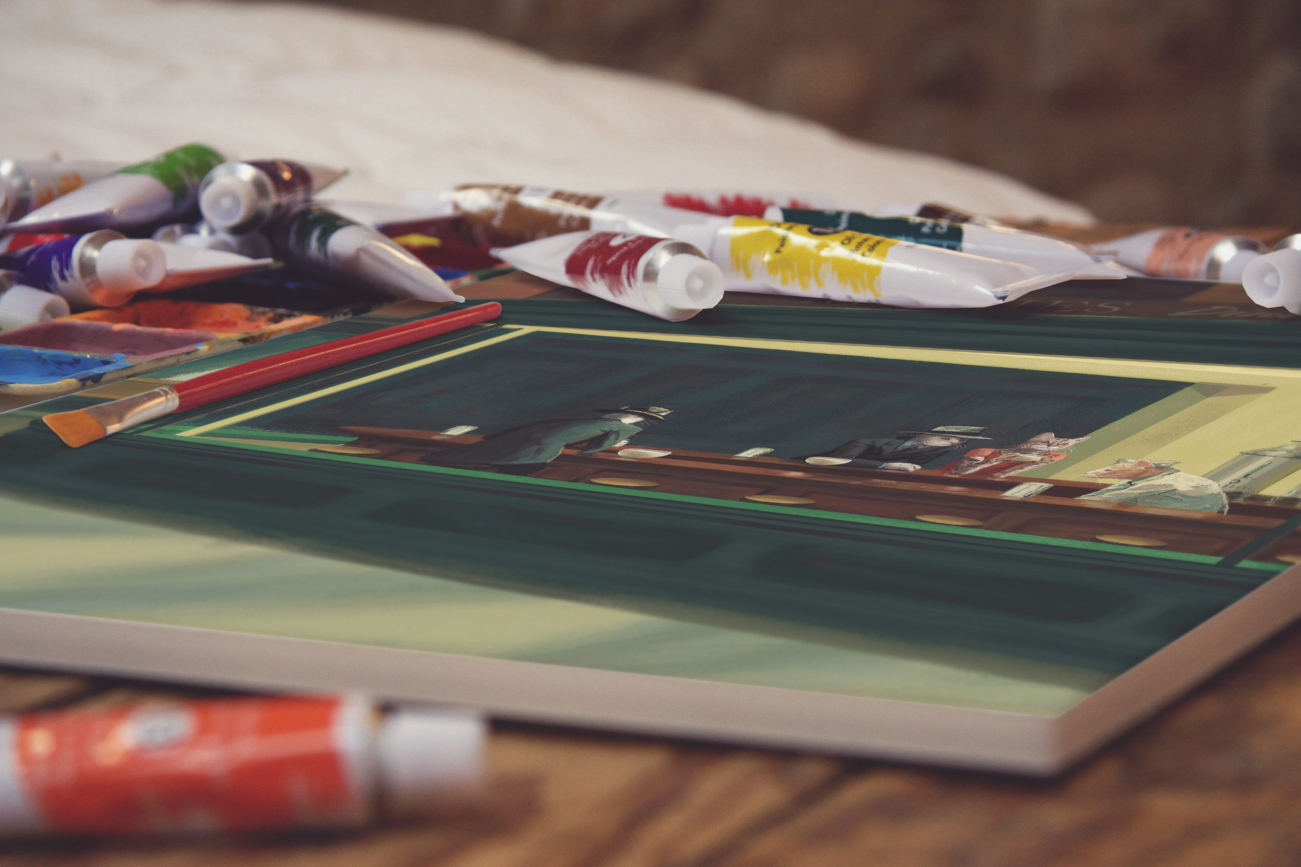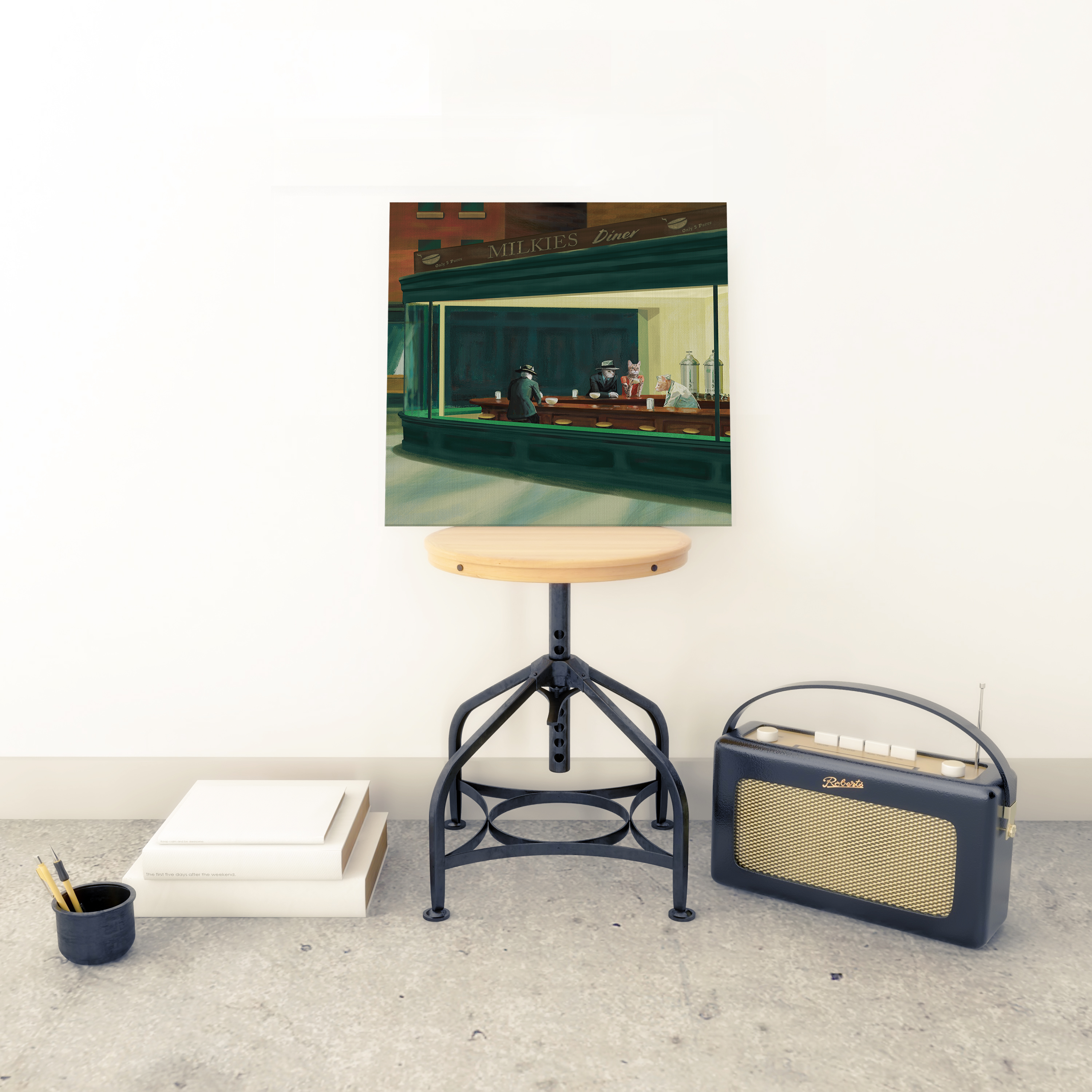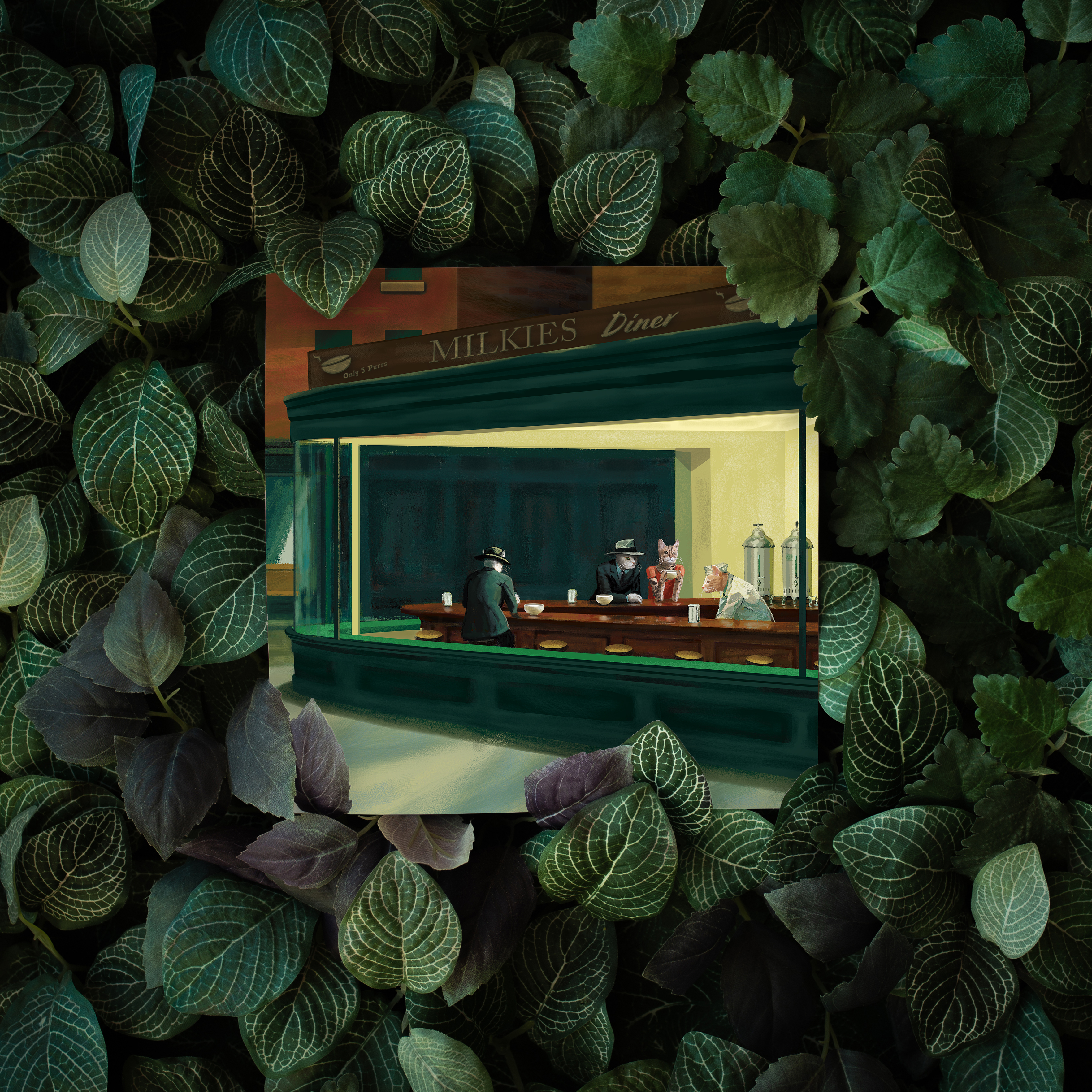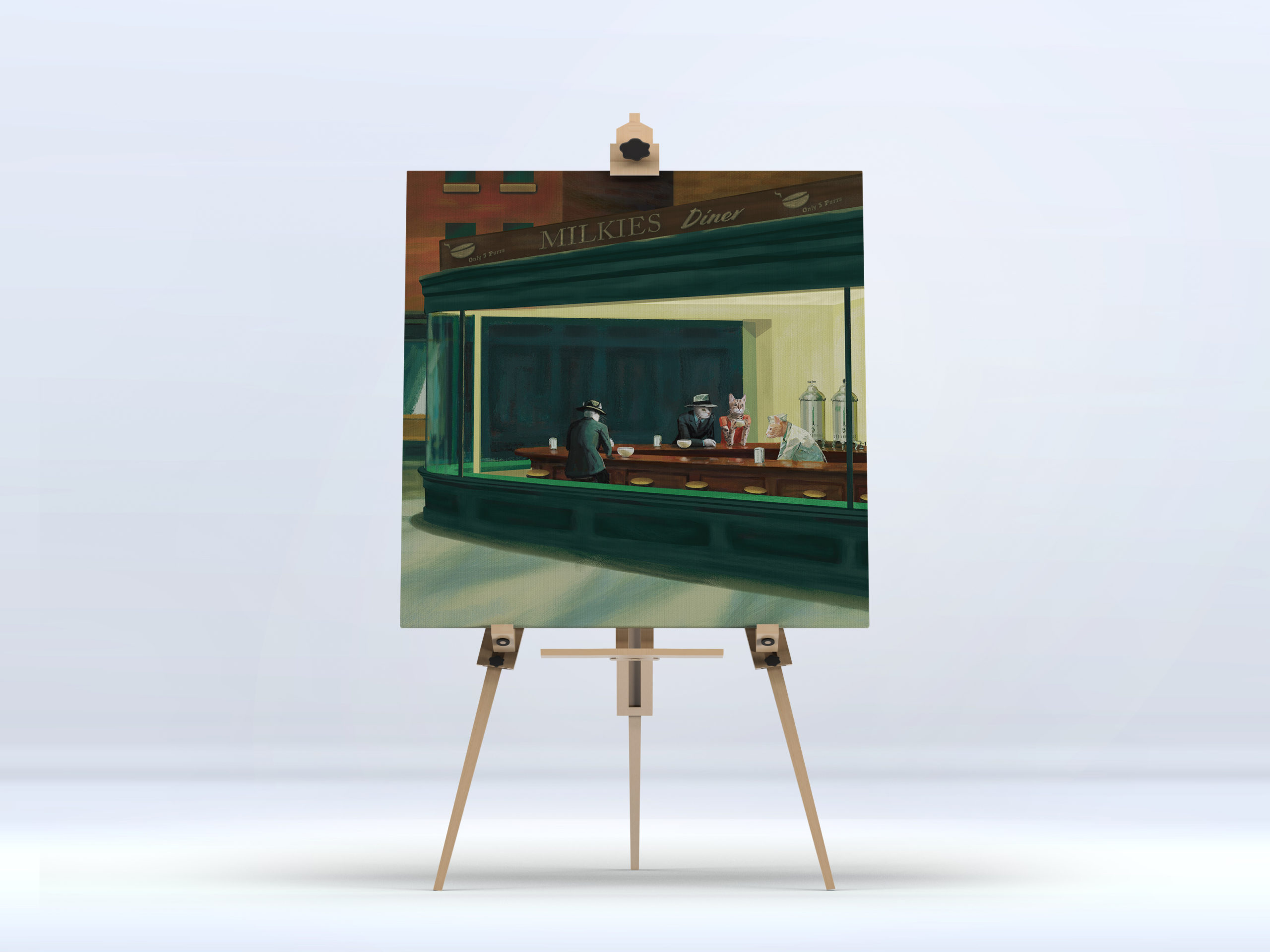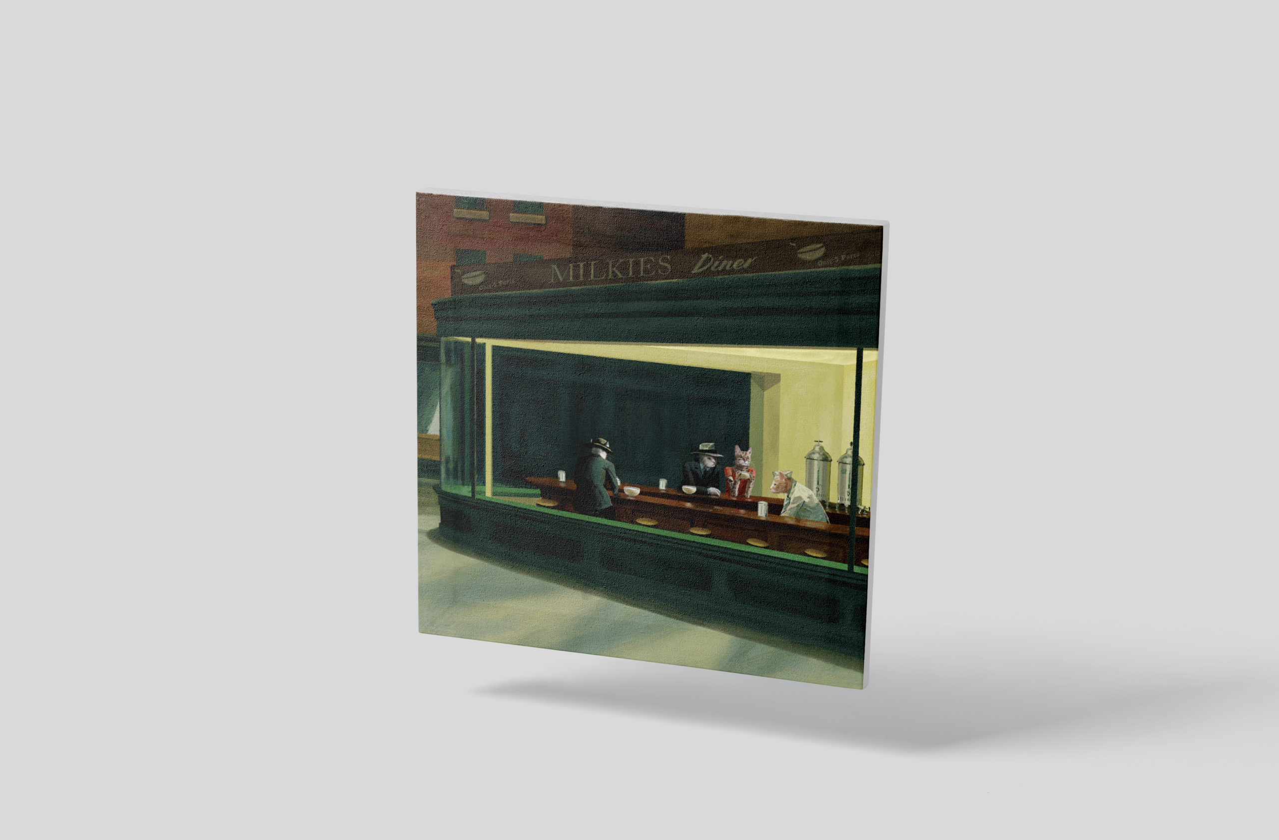 This is a canvas print of our CopyCat digital painting. It includes some educational info about the original painting “Nighthawks” by Edward Hopper on the back.