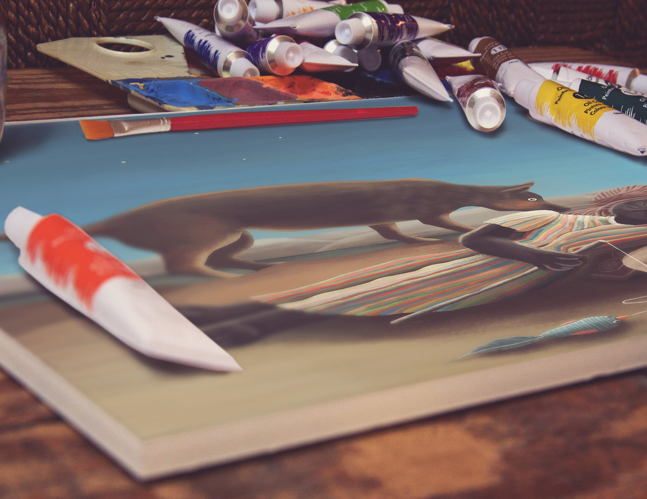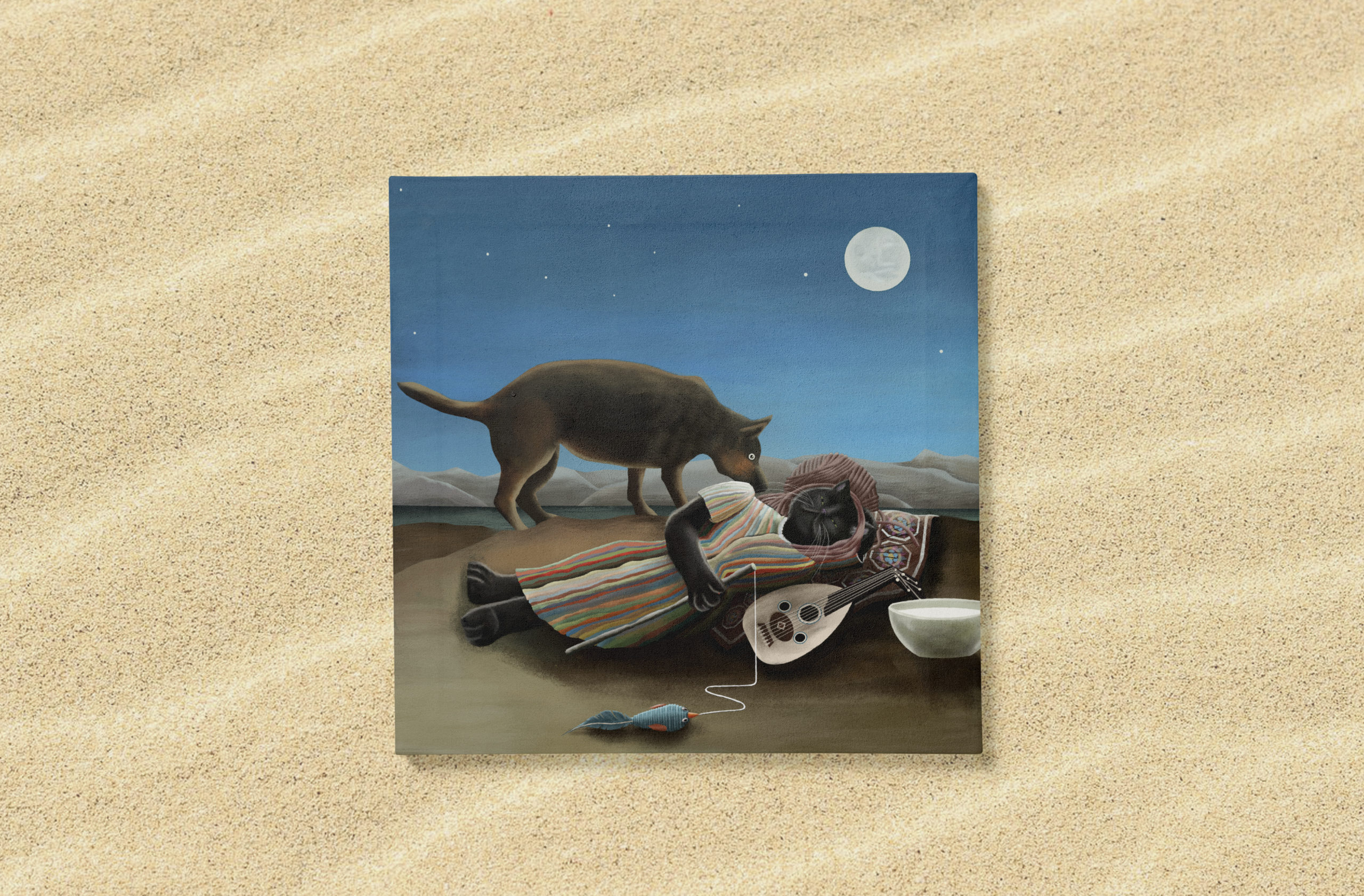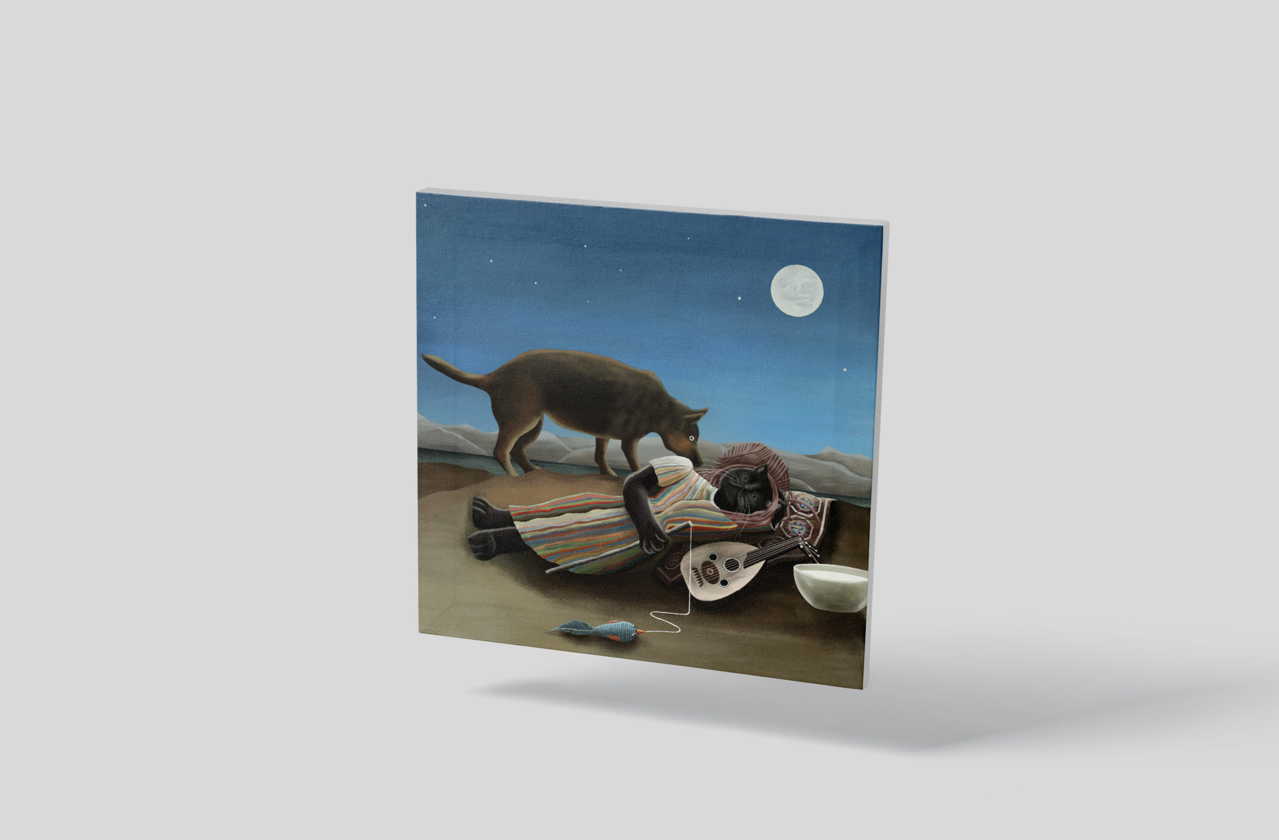 This is a canvas print of our CopyCat digital painting. It includes some educational info about the original painting “The Sleeping Gypsy” by Henri Rousseau on the back.