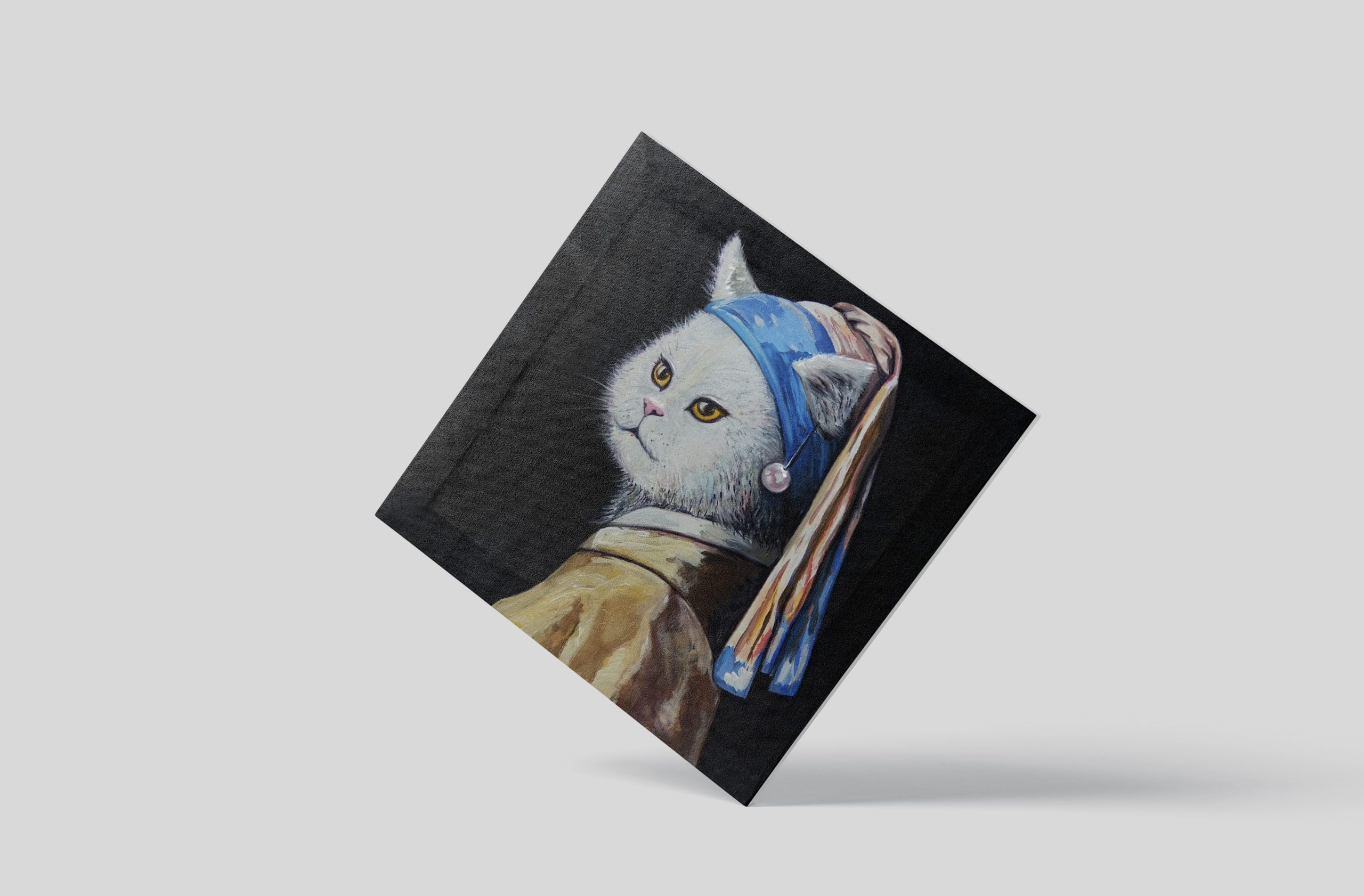 This is a canvas print of our CopyCat acrylic/digital painting. It includes some educational info about the original painting “Girl with a Pearl Earring” by Johannes Vermeer on the back.